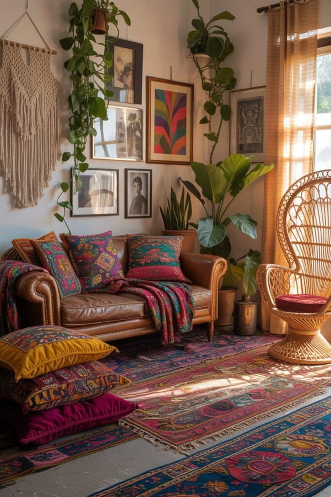 Bohemian décor embraces layers, colors, and creativity. You’ll see patterns from around the world — Moroccan rugs, Indian tapestries, or tribal prints — all harmonizing beautifully.