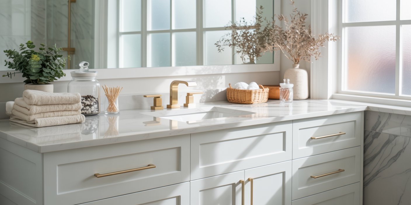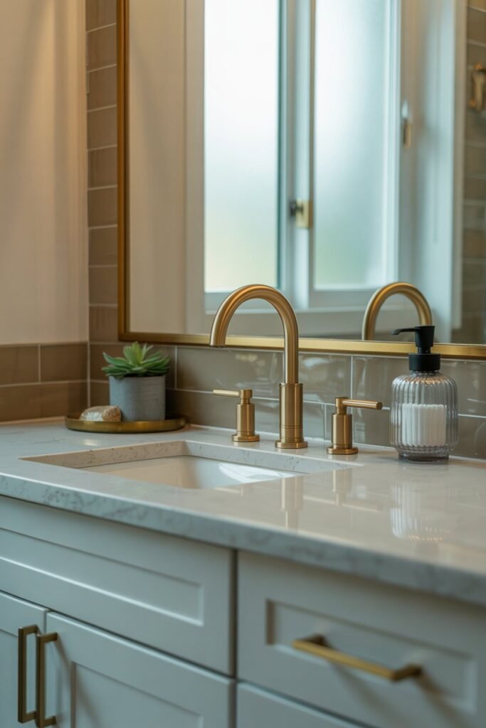 - Swap out cabinet handles, drawer pulls, and towel racks for modern finishes like brushed gold, matte black, or polished chrome.