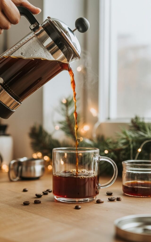 After steeping, I slowly press the filter down to separate the grounds. Now the coffee base is ready, and we can move on to the fun part—making each holiday drink.