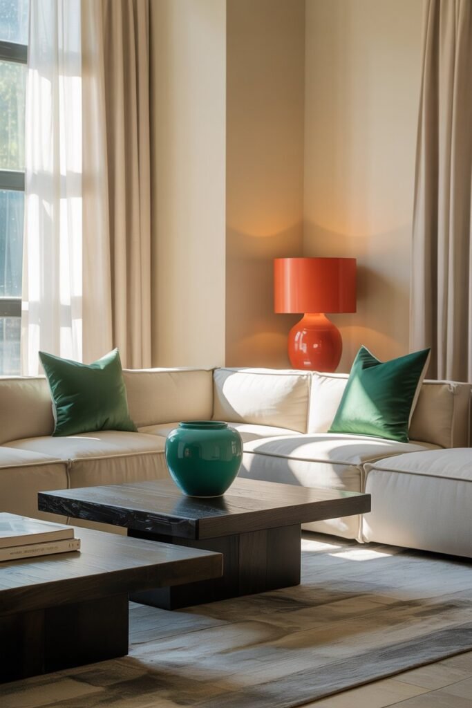• 10% — Accent Color: The fun part! Accent colors appear in decorative objects, pillows, vases, small furniture, or artwork. This small percentage brings energy, pops of personality, and draws the eye to focal points in the room.