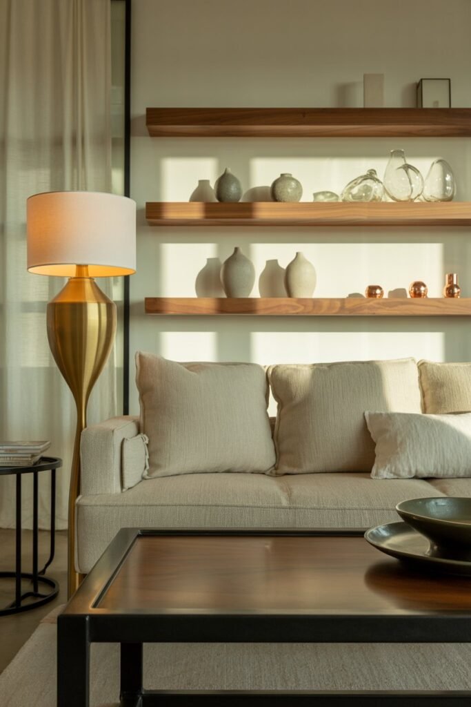 • Group metallic finishes intentionally — a gold lamp with gold décor on a side table complements your accent color.