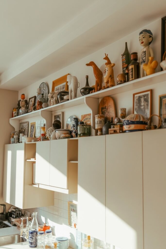 I enjoy displaying special items from travels or meaningful collectibles above my cabinets.