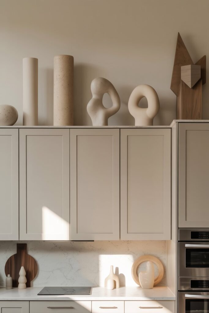 I’ve curated a few simple pieces over the years, and placing them above cabinets adds a gallery-like feel to the kitchen.