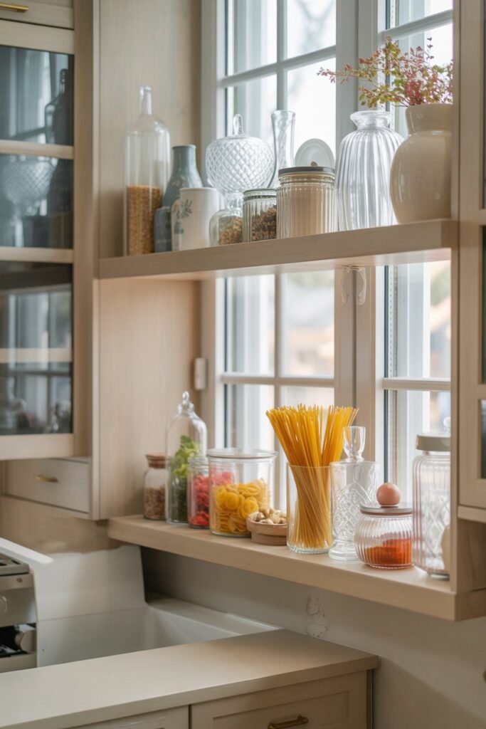 - Stack or line jars and bottles in small clusters to avoid visual clutter.