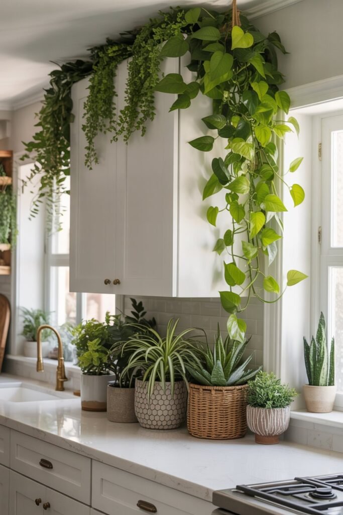One of my favorite ways to breathe life into the space above cabinets is with greenery. Plants instantly add color, texture, and a natural vibe. I’ve tried both real and faux plants, and here’s what I learned: