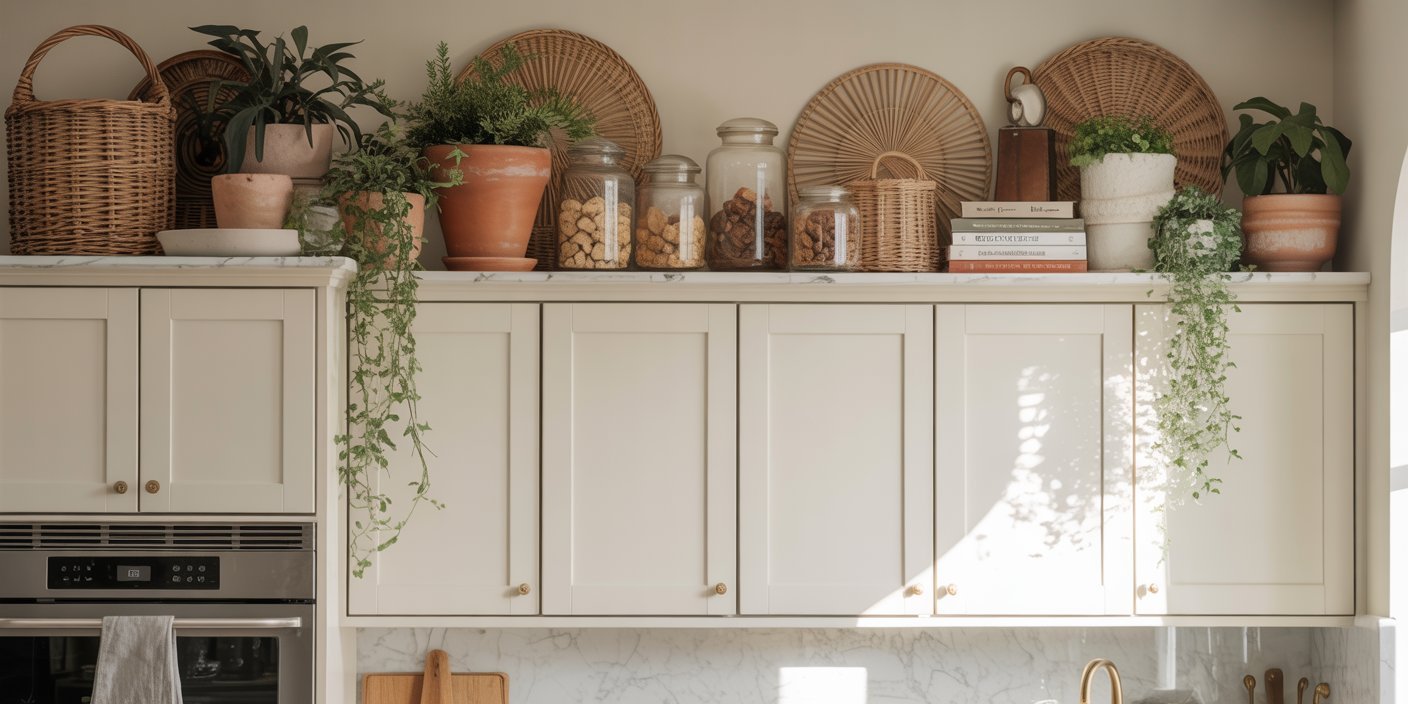 The area above kitchen cabinets is perfect for adding style, color, and personality — from subtle greenery to seasonal accents or decorative collections.