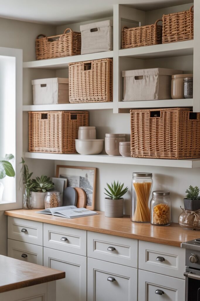 - Use wicker, rattan, or wire baskets that complement your kitchen’s color palette.