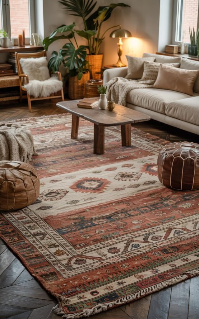 Boho rugs work with layered throws, worn sofas, wooden furniture, and simple shelves. I keep decor minimal and let the rug do most of the visual work.
