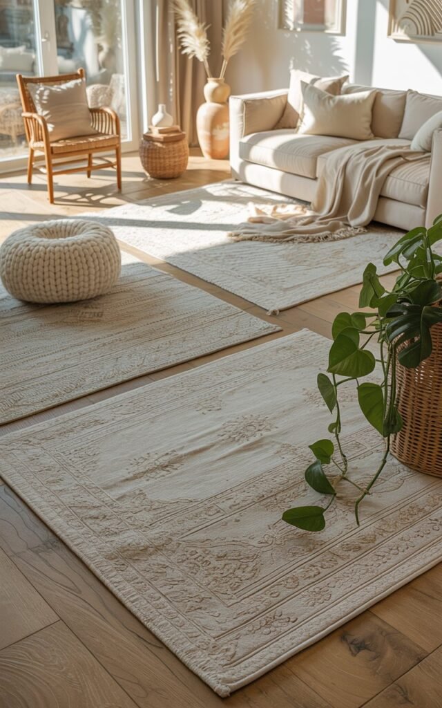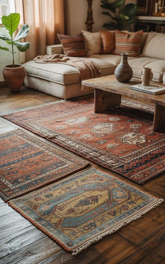 In bedrooms, I slide rugs partially under the bed so bare feet land on something soft. In living areas, I choose sizes big enough for furniture legs to rest comfortably, creating a sense of flow.