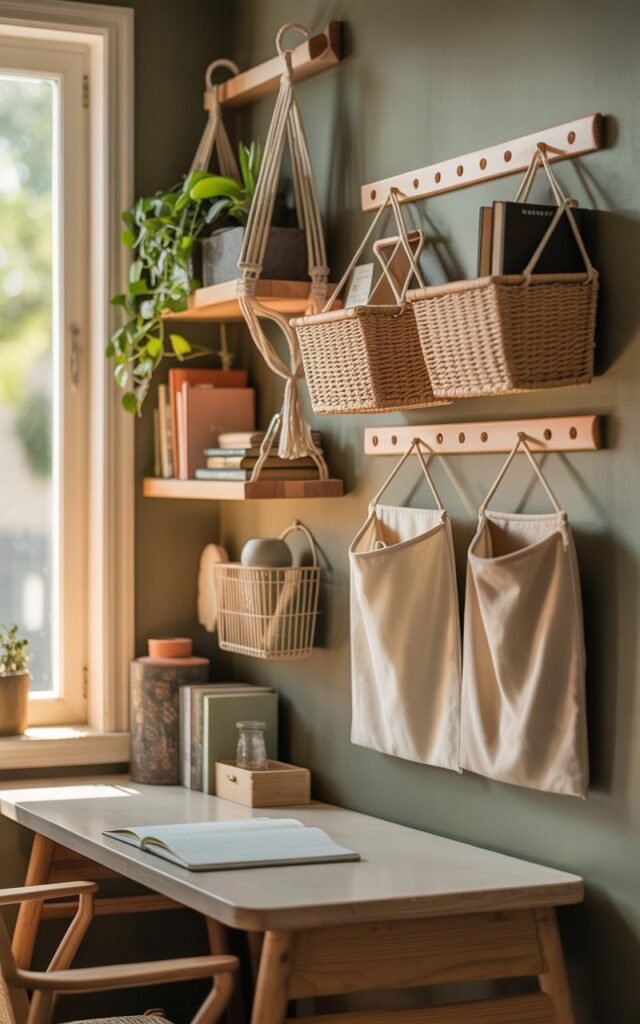 In the office, a similar shelf holds notebooks and a plant. It clears surface space while adding warmth to the walls. These shelves don’t just hold items. They balance the room visually.