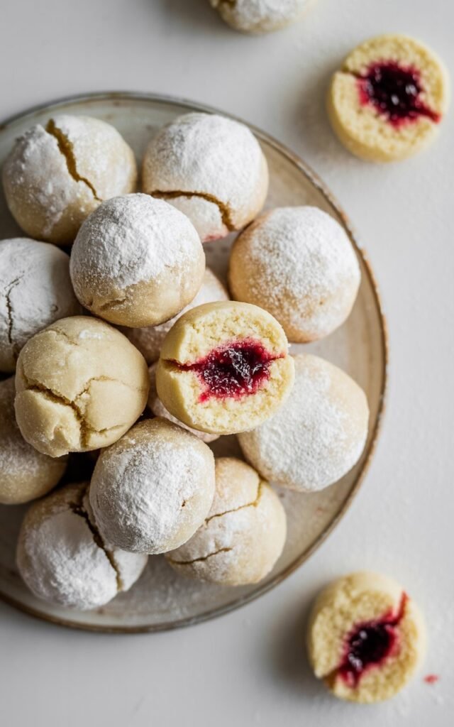 These jam-filled snowball cookies are buttery, tender, lightly sweet, and finished with a soft powdered sugar coating that looks like fresh snow.