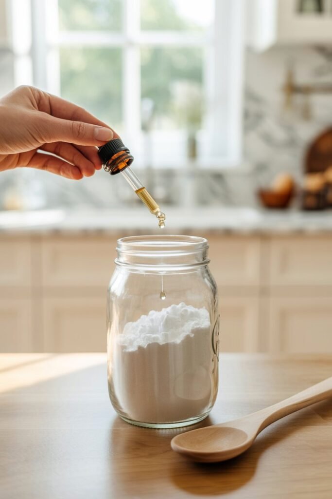 - Fill a small container with baking soda and add 5–10 drops of your favorite essential oil.