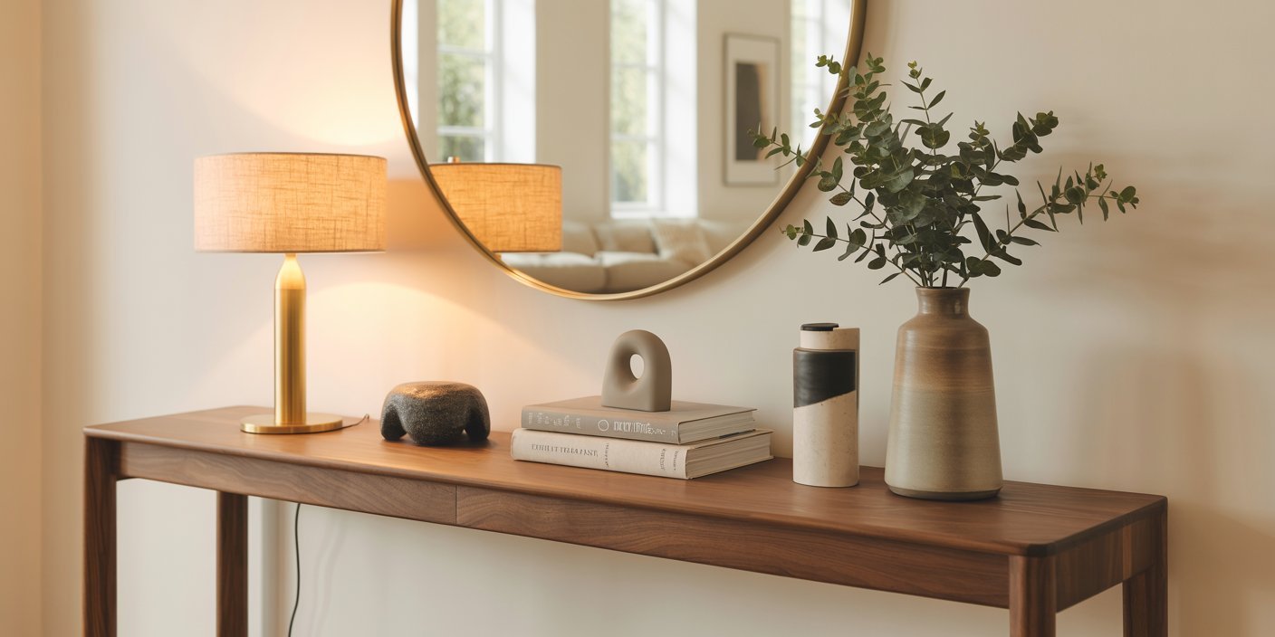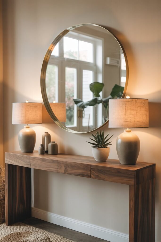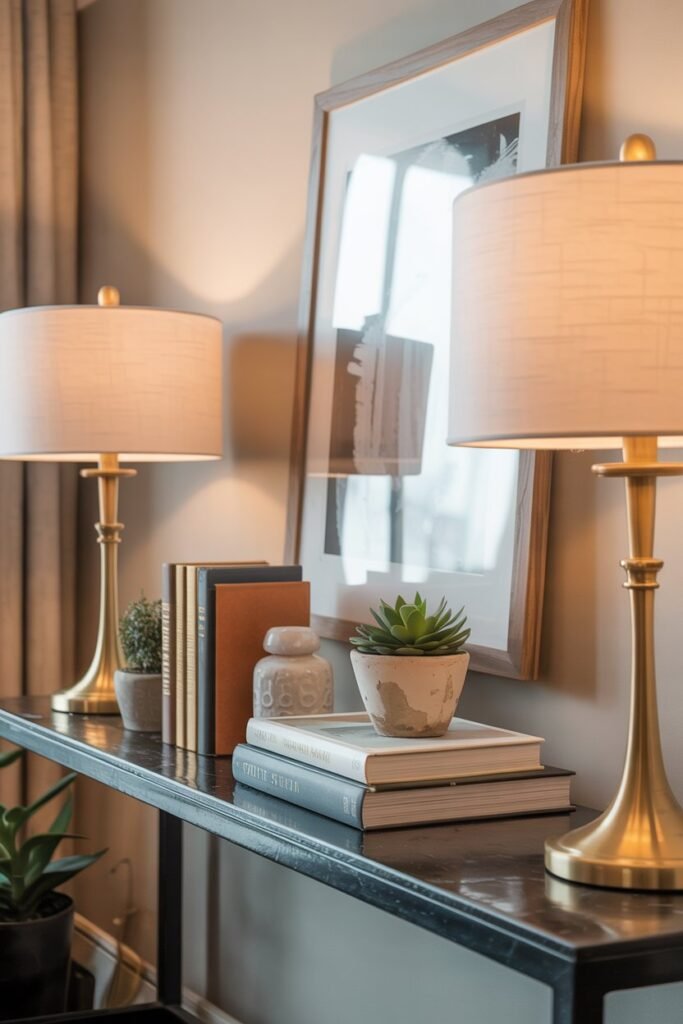 If your console table is near an outlet, a table lamp is an easy way to create soft, inviting light. Choose one that complements your overall style—ceramic or stone bases for earthy tones, metallics for a more modern look.