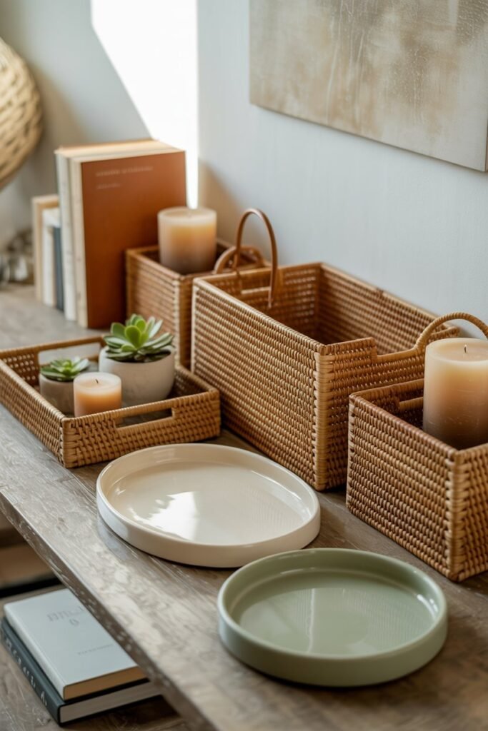 For a cohesive look, stick to one or two color tones for your trays and baskets—like natural rattan, whitewashed wood, or matte black. The goal is for them to blend into the design, not overpower it.