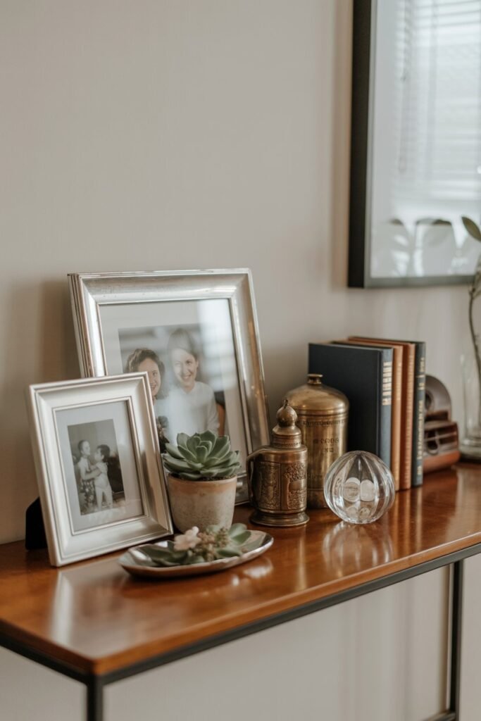 Choose a few pieces that have meaning. Family photos in simple frames, souvenirs from your travels, or small heirlooms work beautifully.