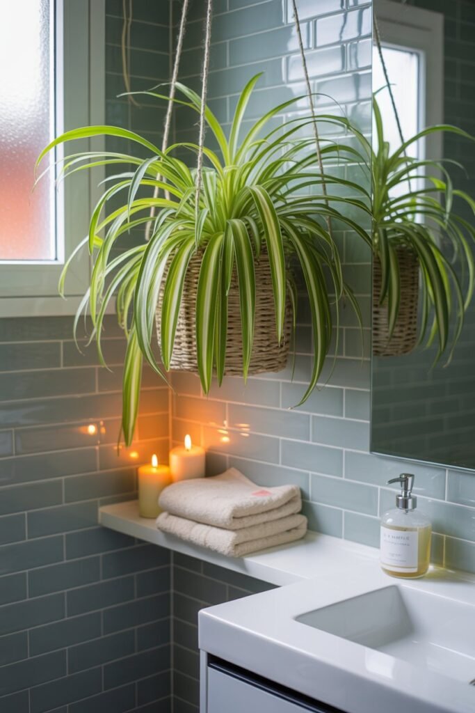 A small cluster of spider plants in clear glass containers makes a bright, refreshing statement on kitchen shelves or bathroom counters. They seem to purify the space visually — and they actually do help clean the air.