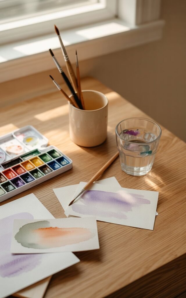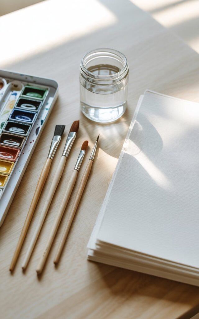 I don’t overcomplicate my setup. A basic watercolor palette, a dependable brush, paper towels, and a cup for water are all I need. Everything fits into a small space so I can begin and end sessions easily.