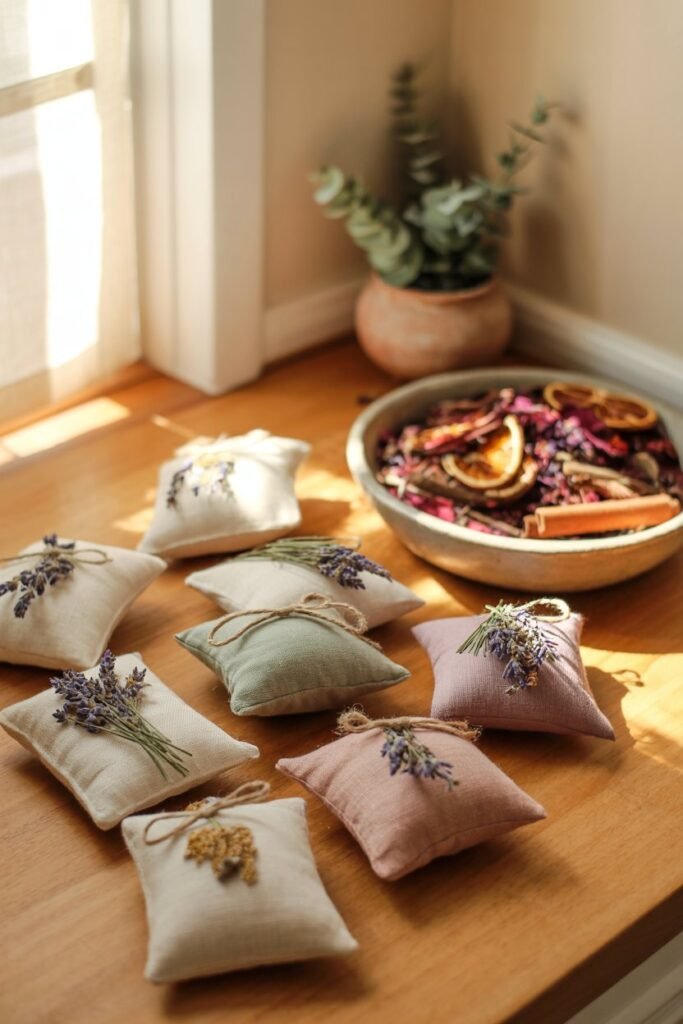 Sachets and potpourri are a fun, hands-on way to bring scent to small spaces. I’ve made little fabric bags filled with dried lavender, rose petals, mint leaves, or even orange peel.